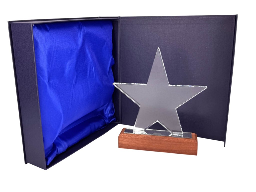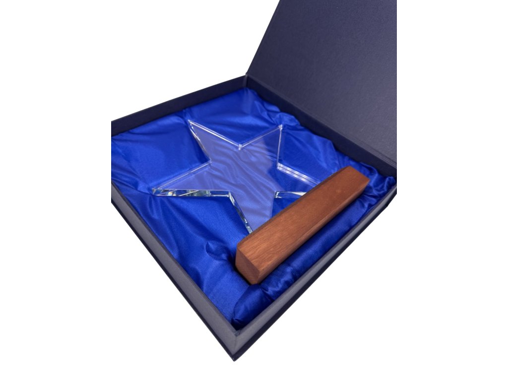 Štýlová sklenená plaketa v tvare hviezdy na drevenom podstavci, s možnosťou gravírovania na sklo. Dizajn skla je ideálnou voľbou pre rôzne druhy spoločenských udalostí, špeciálne športové podujatia a pod.