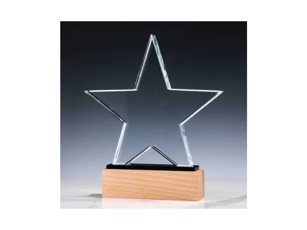 Štýlová sklenená plaketa v tvare hviezdy na drevenom podstavci, s možnosťou gravírovania na sklo. Dizajn skla je ideálnou voľbou pre rôzne druhy spoločenských udalostí, špeciálne športové podujatia a pod.