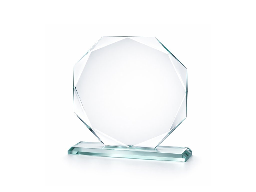 Elegantná sklenená trofej na sklenenom podstavci, tvar oktagon, s možnosťou gravírovania na sklo. Dizajn trofeje je ideálnou voľbou pre rôzne druhy spoločenských udalostí, špeciálne športové podujatia a pod.