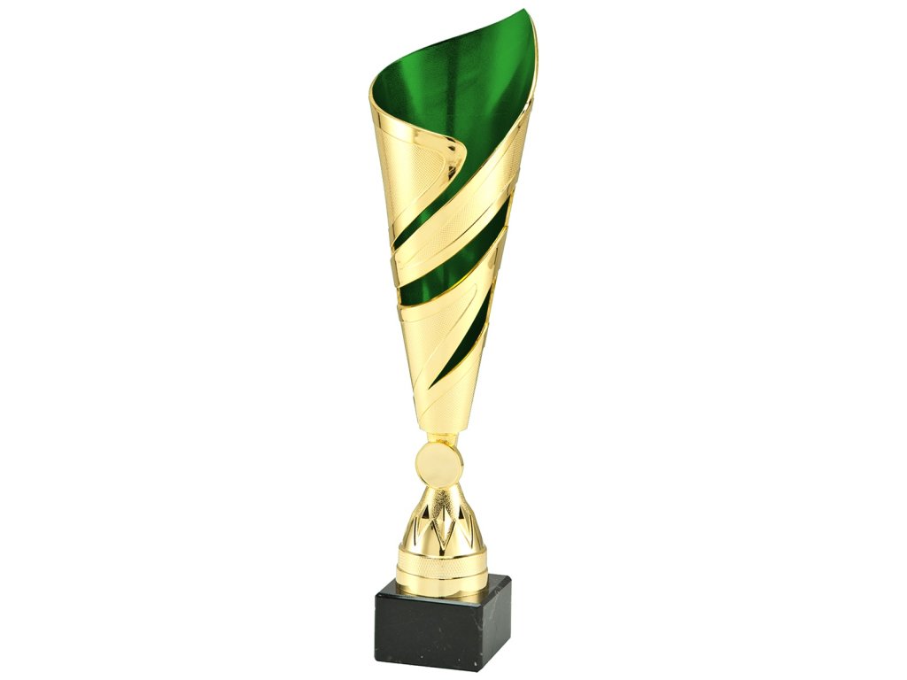 Štýlový pohár s unikátnym tvarom v dvoj-farebnom prevedení na mramorovom podstavci. Trofej je možné doplniť o gravírovaný štítok, ktorý je umiestnený na podstavci. Pre odstupňovanie poradia ocenených sú dostupné 3 farebné varianty.