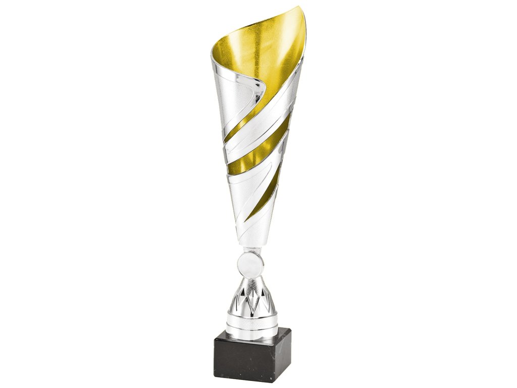 Štýlový pohár s unikátnym tvarom v dvoj-farebnom prevedení na mramorovom podstavci. Trofej je možné doplniť o gravírovaný štítok, ktorý je umiestnený na podstavci. Pre odstupňovanie poradia ocenených sú dostupné 3 farebné varianty.