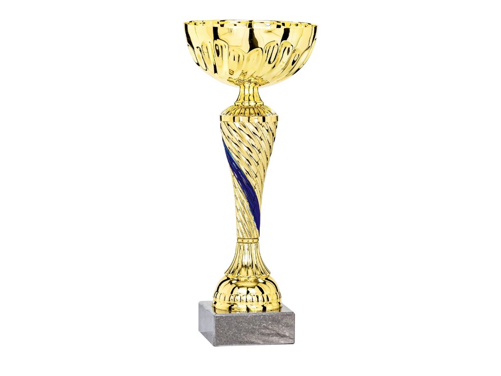 Štýlový zlatý pohár s kalichom uloženým na atraktívnej stopke s modrým detailom, ktorá je umiestnená na mramorovom podstavci. Je ideálnou voľbou pre všetky typy športov a je doplnený o možnosť gravírovaného štítku umiestneného na podstavci. Varianty sú dostupné v 5 veľkostiach pre odstupňovanie poradia ocenených.