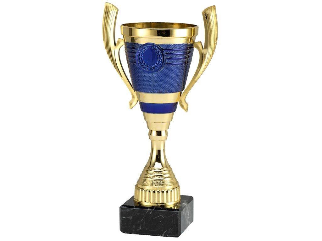 Štýlový zlatý pohár s modrým detailom na kalichu a uškami uložený na mramorovom podstavci. Trofej je možné doplniť o gravírovaný štítok, ktorý je umiestnený na podstavci. Dostupné sú 3 varianty na ocenenie poradia.