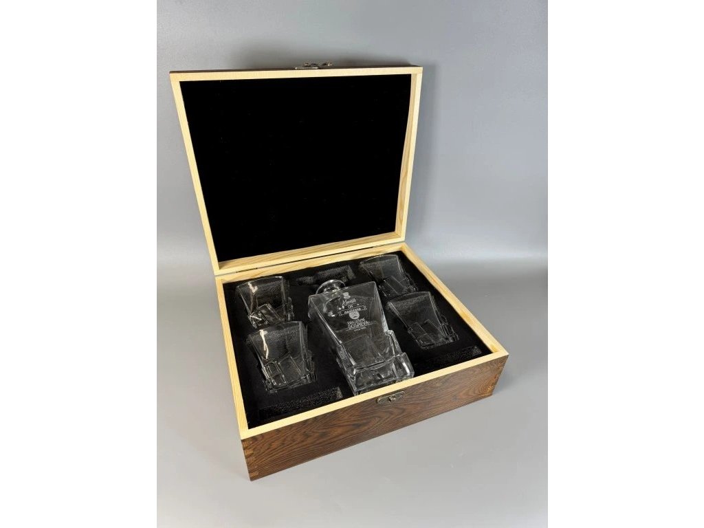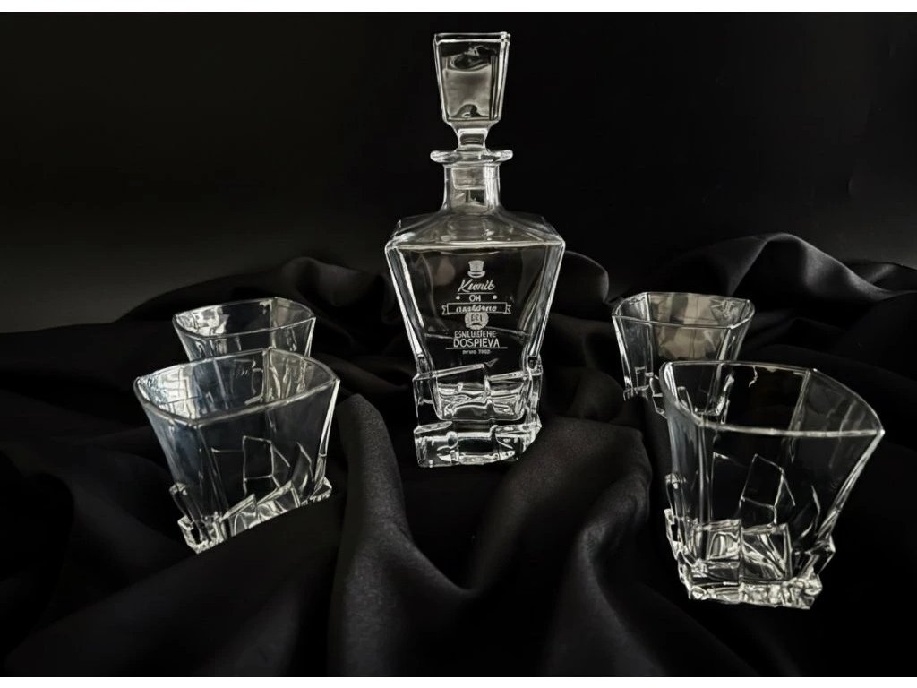 Táto štýlová sada obsahuje sklenenú fľašu na whisky a štyri poháre, ktoré spolu tvoria dokonalý darček pre milovníkov kvalitného alkoholu. Vyniká čistým dizajnom, precíznym spracovaním a možnosťou gravírovania mena, loga alebo venovania podľa želania IBA NA FĽAŠU.